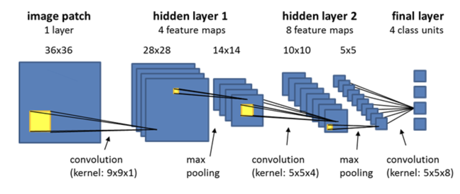 예를 들어, 아래의 이미지처럼 36x36 사이즈의 이미지는 9x9 커널과 콘볼루션 연산을 통해 28x28 사이즈로 크기가 줄어듭니다.