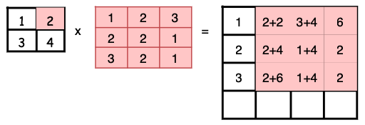 아래 이미지는 2x2 Input Tensor 와 2x2 Kernel Tensor 의 Transpose Convolution 을 보여줍니다.