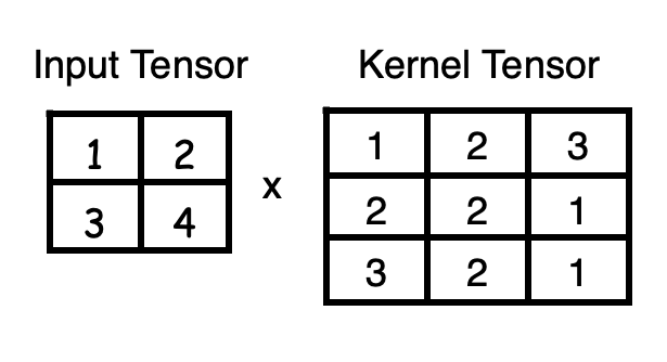 아래와 같이 2x2 Input Tensor 와 3x3 Kernel Tensor 가 존재한다고 가정하겠습니다.