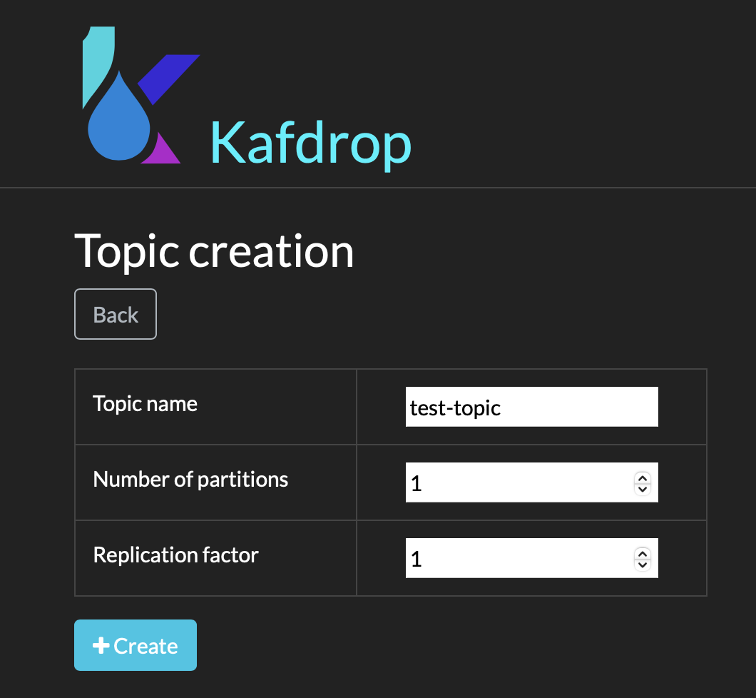 http://localhost:9000 인 Kafdrop 웹 UI 에서 test-topic 이라는 이름의 Topic 을 생성하겠습니다.