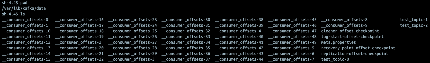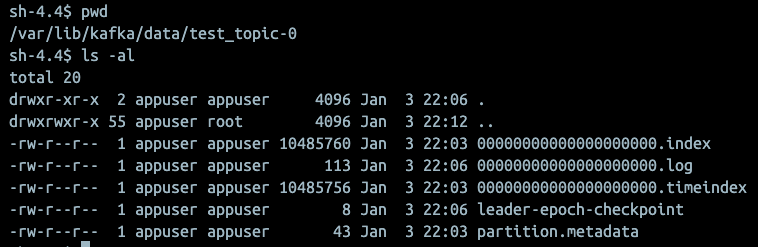 ls -ls /var/lib/kafka/data total 20 0 -rw-r--r-- 1 appuser appuser 0 Dec 26 05:29 cleaner-offset-checkpoint 4 -rw-r--r-- 1 appuser appuser 4 Dec 26 05:41 log-start-offset-checkpoint 4 -rw-r--r-- 1 appuser appuser 88 Dec 26 05:29 meta.properties 4 -rw-r--r-- 1 appuser appuser 19 Dec 26 05:41 recovery-point-offset-checkpoint 4 -rw-r--r-- 1 appuser appuser 19 Dec 26 05:41 replication-offset-checkpoint 4 drwxr-xr-x 2 appuser appuser 4096 Dec 26 05:40 test-topic-0