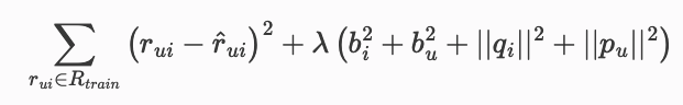 위 표현식은 Optimization 을 수행하기 위해서 실제 값인 $r_{ui}$ 와 예측 값인 $\widehat{r}_{ui}$ 의 RMSE 를 계산합니다.