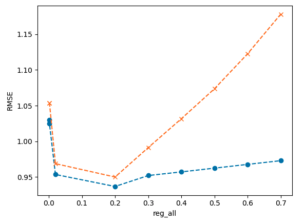 rmse_list = [] biased_false_rmse_list = [] reg_alls = [0.001, 0.002, 0.02, 0.2, 0.3, 0.4, 0.5, 0.6, 0.7] for reg_all in reg_alls: algo = SVD(n_factors=200, n_epochs=100, biased=False, reg_all=reg_all, verbose=False) model = algo.fit(trainset) predictions = model.test(testset, verbose=False) print(reg_all, accuracy.rmse(predictions, verbose=False)) biased_false_rmse_list.append(accuracy.rmse(predictions, verbose=False)) algo = SVD(n_factors=200, n_epochs=100, biased=True, reg_all=reg_all, verbose=False) model = algo.fit(trainset) predictions = model.test(testset, verbose=False) print(reg_all, accuracy.rmse(predictions, verbose=False)) rmse_list.append(accuracy.rmse(predictions, verbose=False))