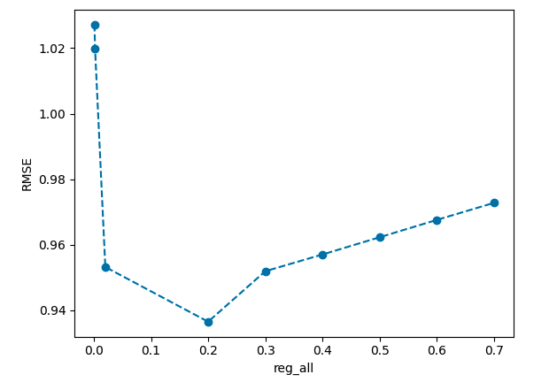 rmse_list = [] reg_alls = [0.001, 0.002, 0.02, 0.2, 0.3, 0.4, 0.5, 0.6, 0.7] for reg_all in reg_alls: algo = SVD(n_factors=200, n_epochs=100, biased=True, reg_all=reg_all, verbose=False) model = algo.fit(trainset) predictions = model.test(testset, verbose=False) print(reg_all, accuracy.rmse(predictions, verbose=False)) rmse_list.append(accuracy.rmse(predictions, verbose=False))