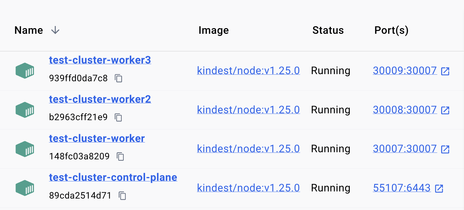 kind create cluster \ --name test-cluster \ --image kindest/node:v1.25.0 \ --config /tmp/kind_cluster.yaml아래 이미지는 Docker Desktop 에서 확인할 수 있는 결과입니다.