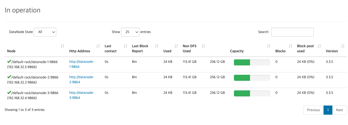 1개의 네임노드 서비스와 3개의 데이터노드 서비스를 실행합니다.