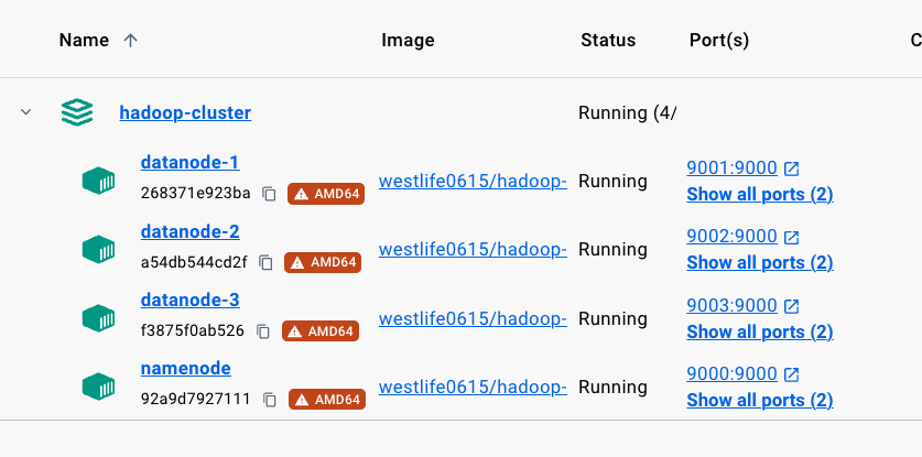 version: '3' services: namenode: image: westlife0615/hadoop-base:0.0.1 platform: linux/amd64 container_name: namenode hostname: namenode ports: - "9870:9870" - "9000:9000" command: "/bin/bash -c 'hdfs namenode -format && hdfs namenode'" datanode-1: image: westlife0615/hadoop-base:0.0.1 platform: linux/amd64 container_name: datanode-1 hostname: datanode-1 ports: - "9861:9864" - "9001:9000" command: ["hdfs", "datanode"] datanode-2: image: westlife0615/hadoop-base:0.0.1 platform: linux/amd64 container_name: datanode-2 hostname: datanode-2 ports: - "9862:9864" - "9002:9000" command: ["hdfs", "datanode"] datanode-3: image: westlife0615/hadoop-base:0.0.1 platform: linux/amd64 container_name: datanode-3 hostname: datanode-3 ports: - "9863:9864" - "9003:9000" command: ["hdfs", "datanode"]이제 docker-compose 를 실행합니다.